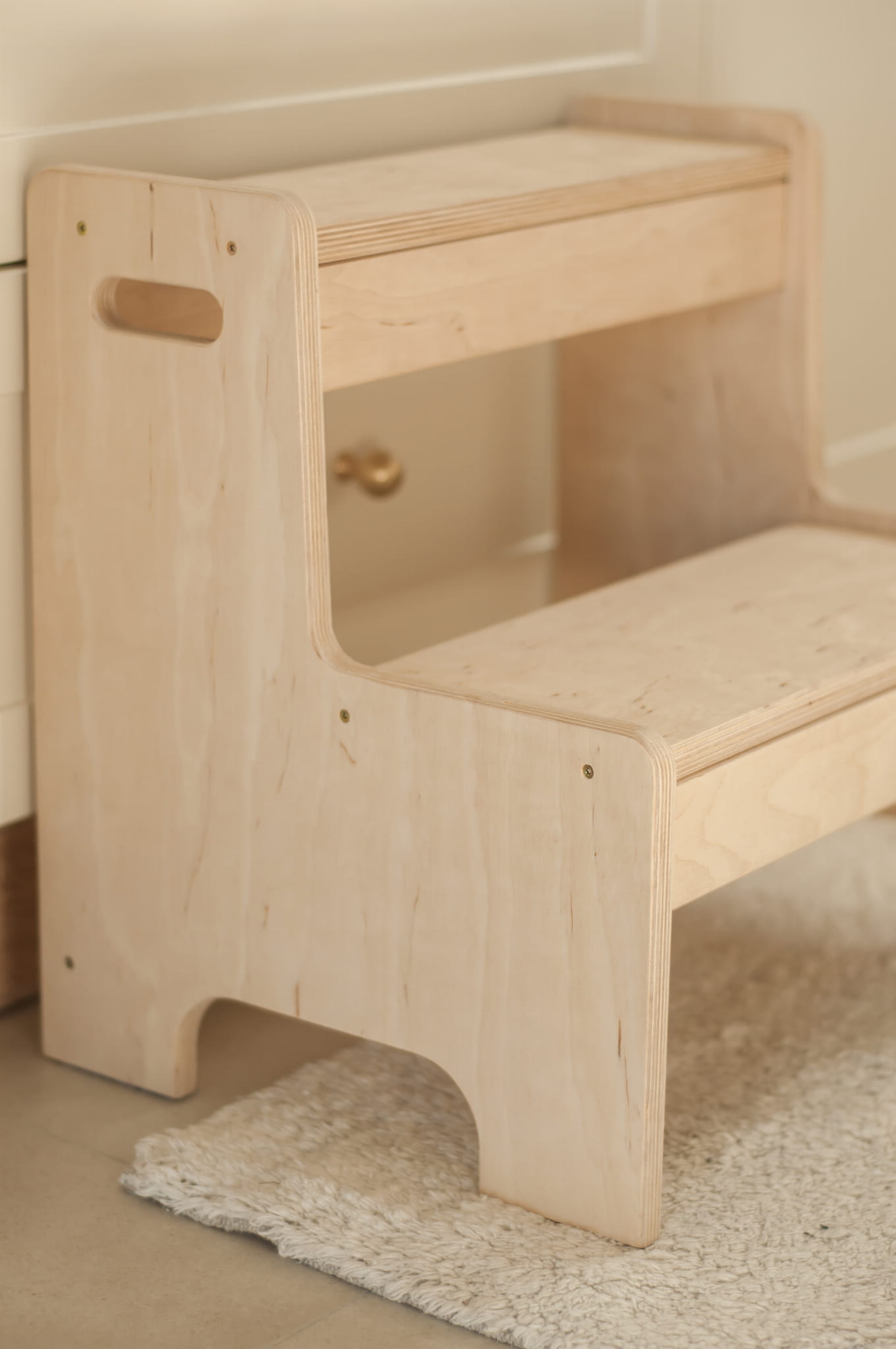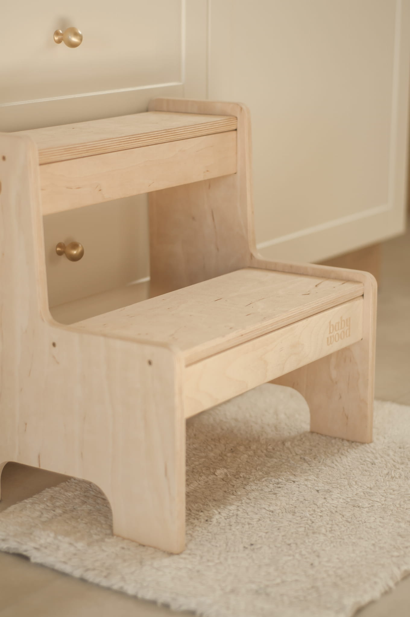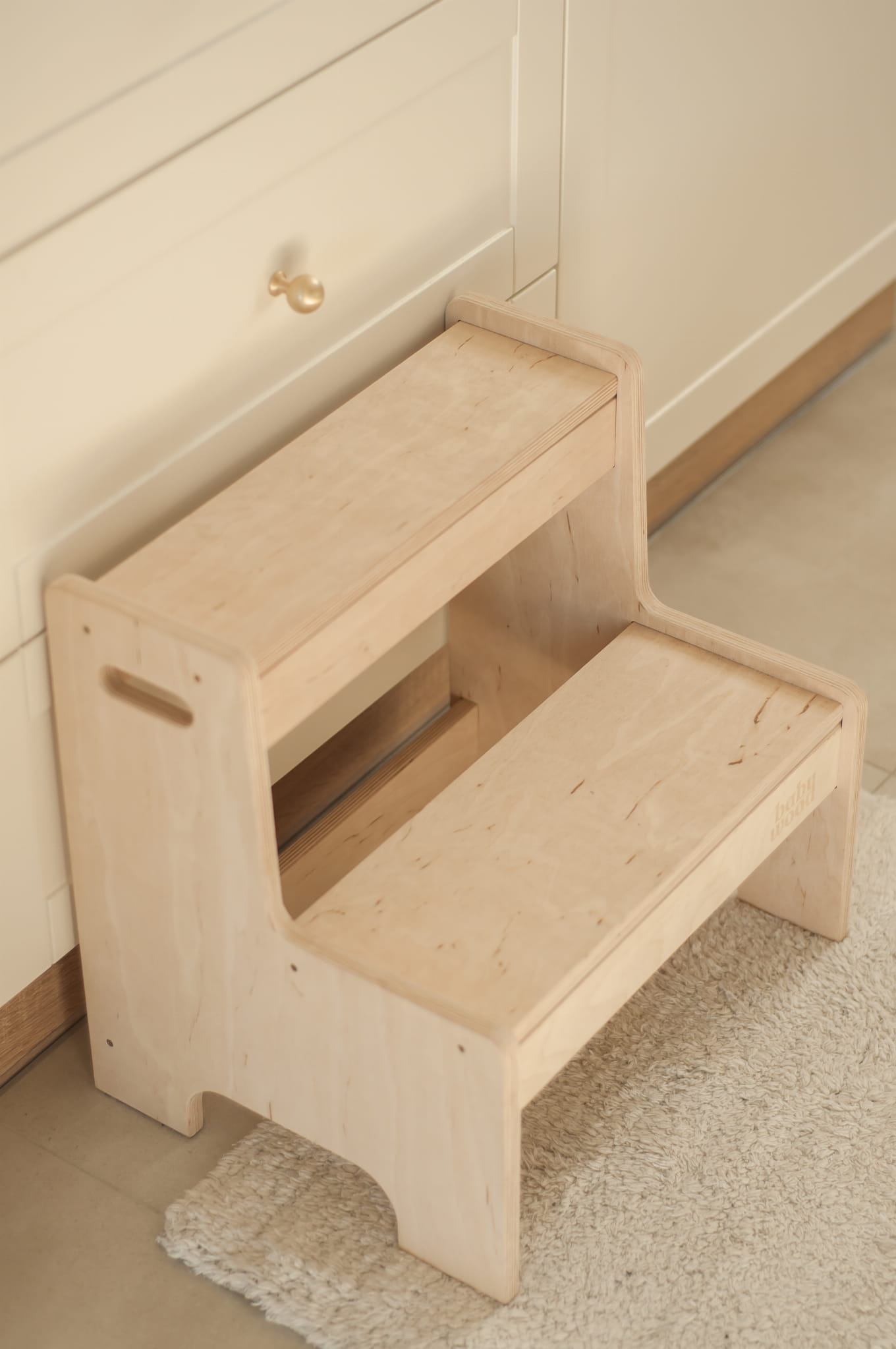 Złożony z dwóch stopni podest, ułatwi dziecku sięganie po to, co do tej pory, ze względu na niewielki wzrost, nie było dla niego dostępne. Podczas procesu tworzenia, dużą wagę przyłożyliśmy do kwestii bezpieczeństwa dziecka. Zaokrąglone ranty oraz gładkie wykończenie zapobiegną niechcianym wypadkom i skaleczeniom.