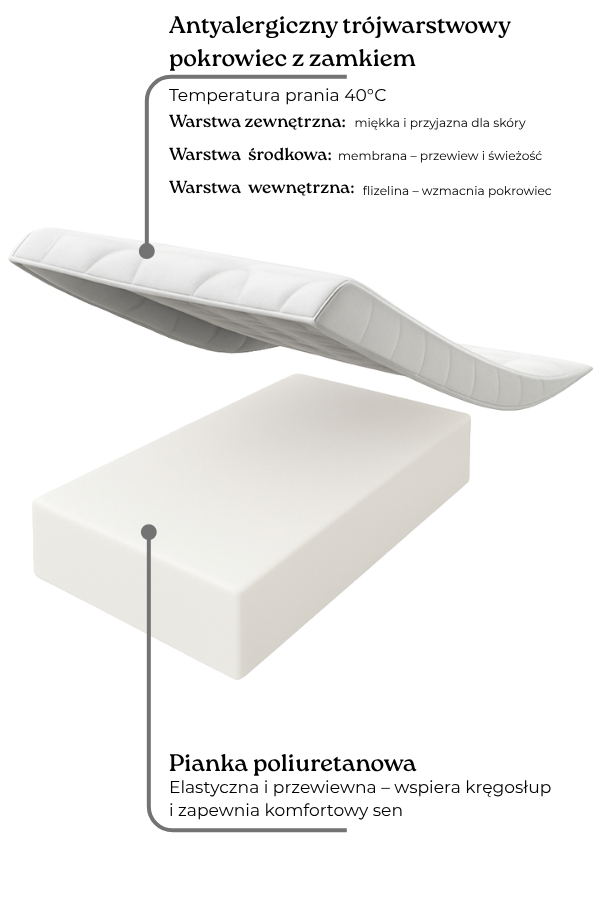 | Pokrowiec | Antyalergiczny, z zamkiem, można prać w 40°C |