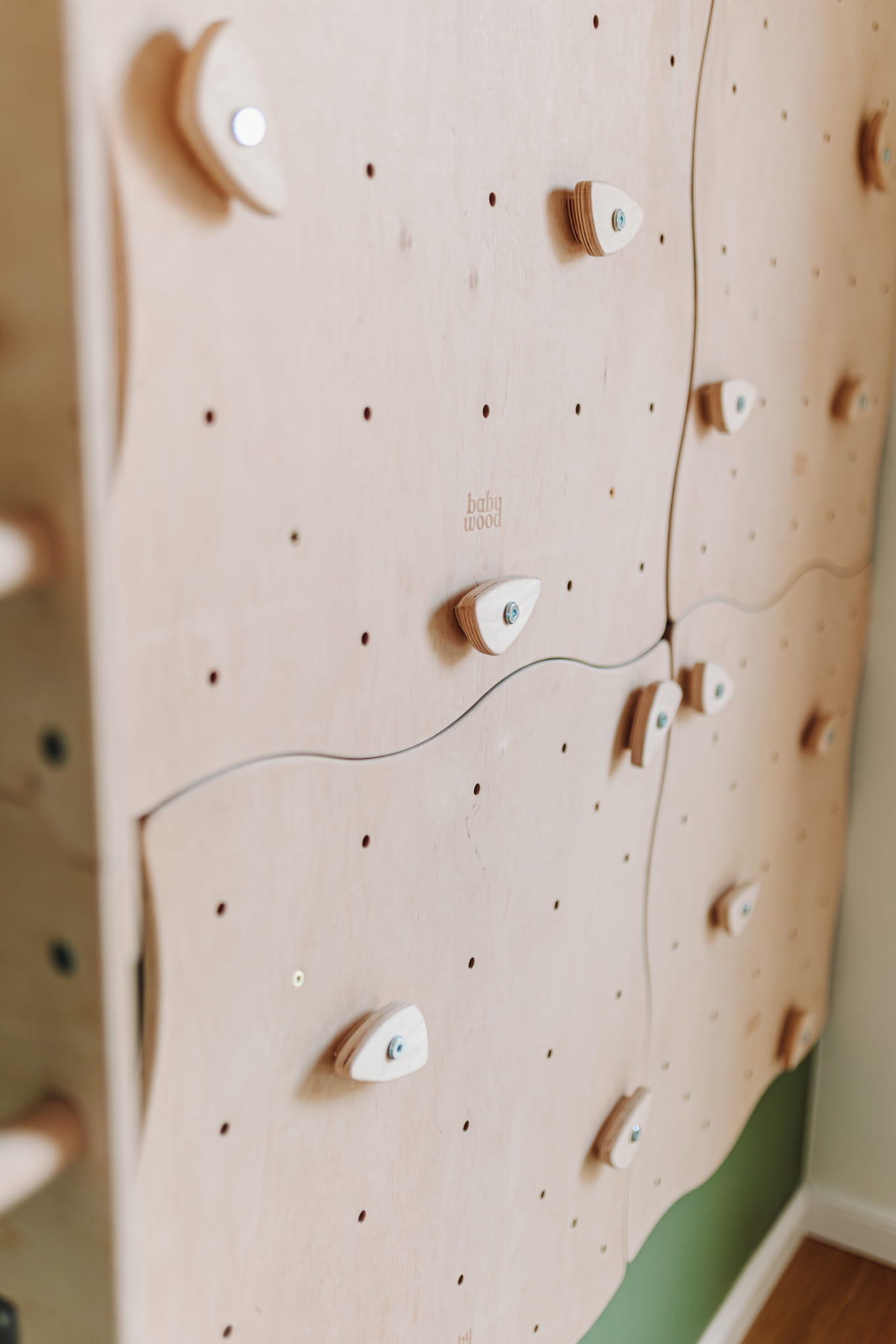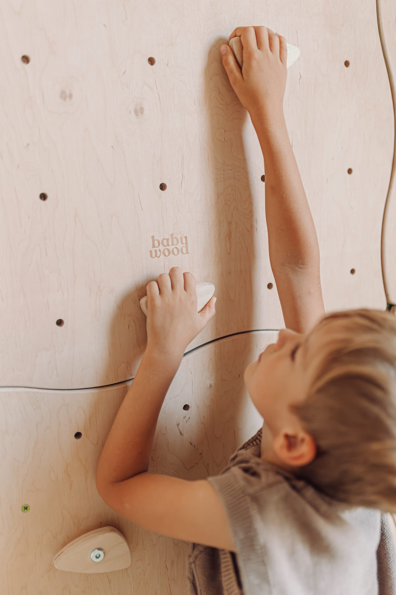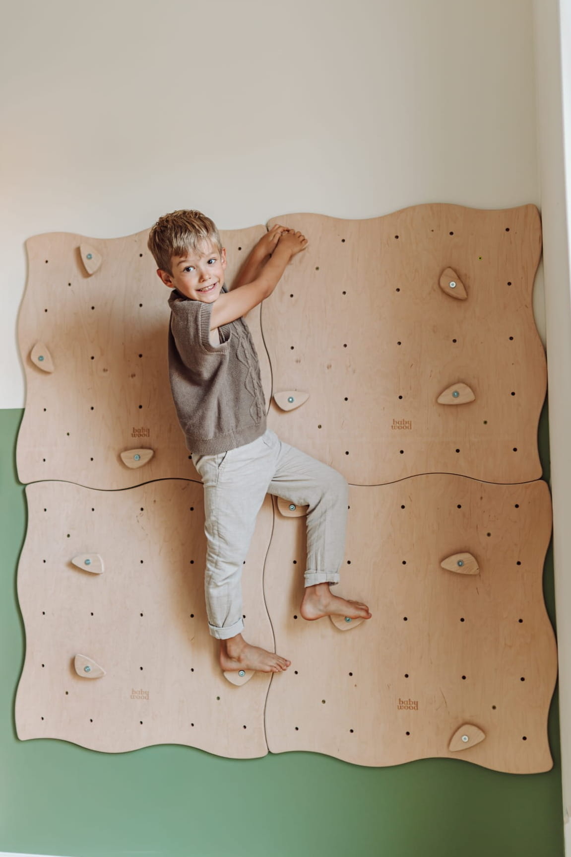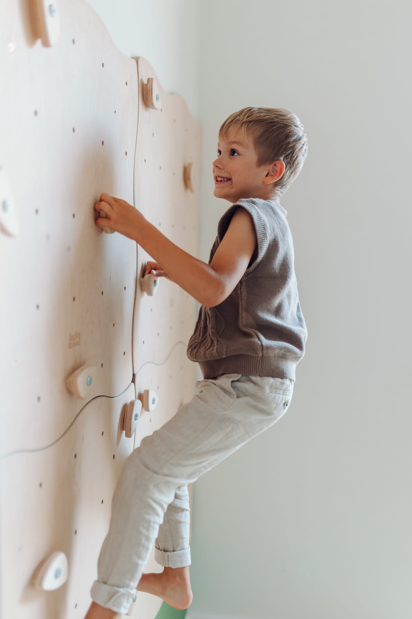 - Wspinaczka dostosowana do możliwości. Możesz regulować trudność trasy – rozstawiając chwyty bliżej lub dalej od siebie, tworzysz ścieżki odpowiednie dla wieku i umiejętności dziecka. Dzięki temu zabawa jest zawsze ekscytująca, ale nie zniechęca zbyt dużą trudnością.