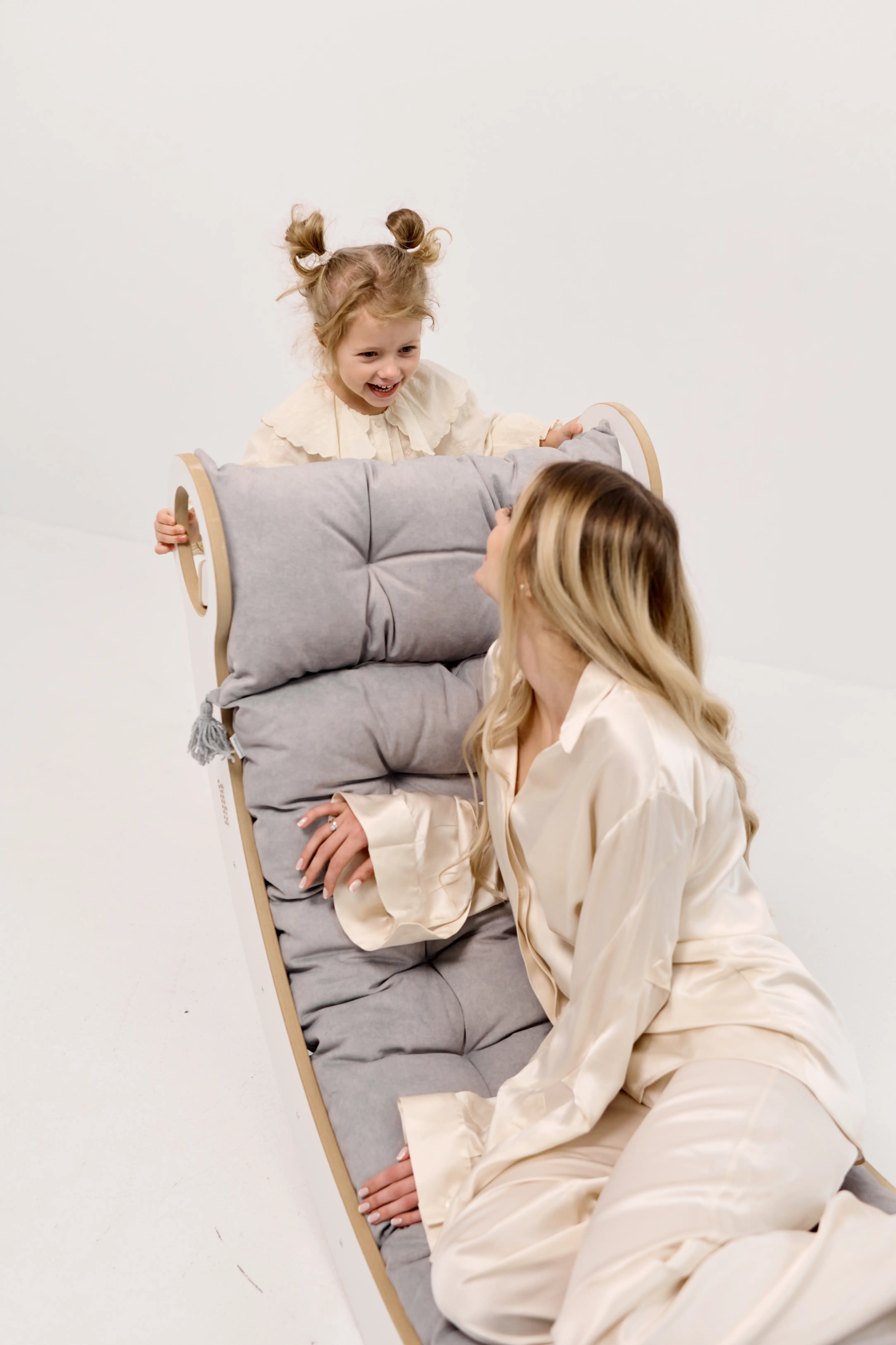 Zagłówek znajdziecie w czterech wyjątkowych kolorach - beżowym, oliwkowym, szarym i różowym. Bliźniacza z poduszkami do bujaków kolorystyka pozwoli dopasować zagłówek idealnie do dużej poduchy, którą znajdziesz TUTAJ.